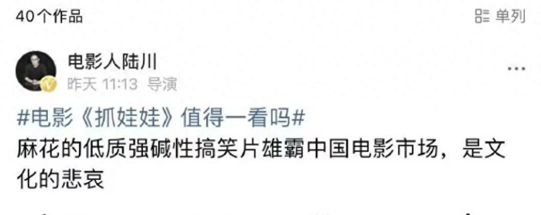 编者按:最近陆川导演又滋事儿了。先是在某平台上发布了《握娃娃》是低质强碱性搞笑片雄霸中国电影商场是文化的悼念。随后又赶紧在另一个平台上示意我方被盗号了ky体育官网登录入口网页版,何况称沈腾是手足,小史是亲弟。随背面条安全出来复兴定了性,陆川并莫得被盗号,后果陆川在酬酢平台上演出了一部搞笑的笑剧。那么被陆川如斯讪笑辱弄的《握娃娃》,简直有这样不胜吗?