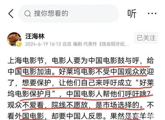著明导演汪海林就对这些跳出来质问不雅众的电影东说念主进行了月旦,好莱坞电影被中国不雅众淹没,想保护让他们好莱坞东说念主我方来,用得着中国电影东说念主命令和保护吗?汪导演还将好莱坞电影遇冷归因于市集原因,淌若专家爱看,电影院能不放吗?专家不想看异邦电影,还要反念念,反念念什么呢?