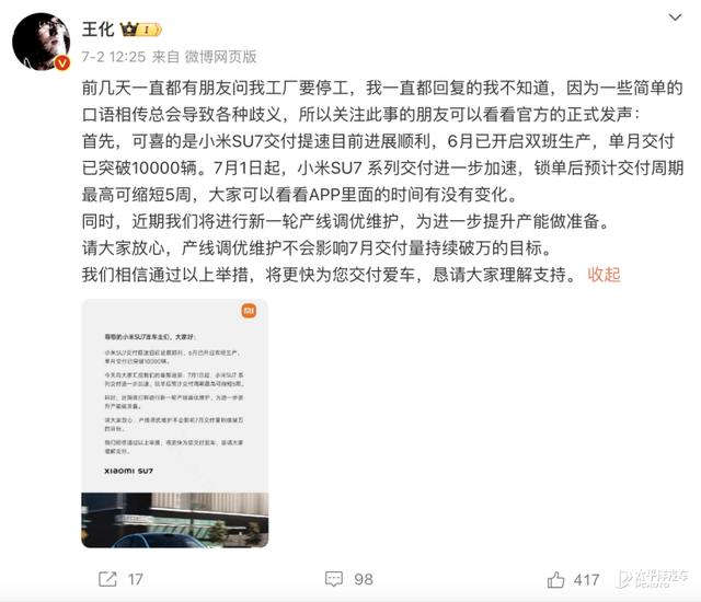 7月2日欧洲杯体育,音书称小米汽车工场因高温停工,小米集团公关部总司理王化在微博上发文修起,他暗意:“前几天一直齐有一又友问我工场要停工,我一直齐回复的我不知谈,因为一些通俗的白话相传总会导致各式歧义,是以饶恕此事的一又友不错望望官方的负责发声。”