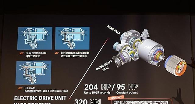 电子能源单位可提供恒定的 95 匹马力及 320牛.米扭矩输出,并在 10~15 秒之间提供 204 匹最大马力,具备纯电行驶、高性能复合能源行驶及内燃机行驶阵势。
