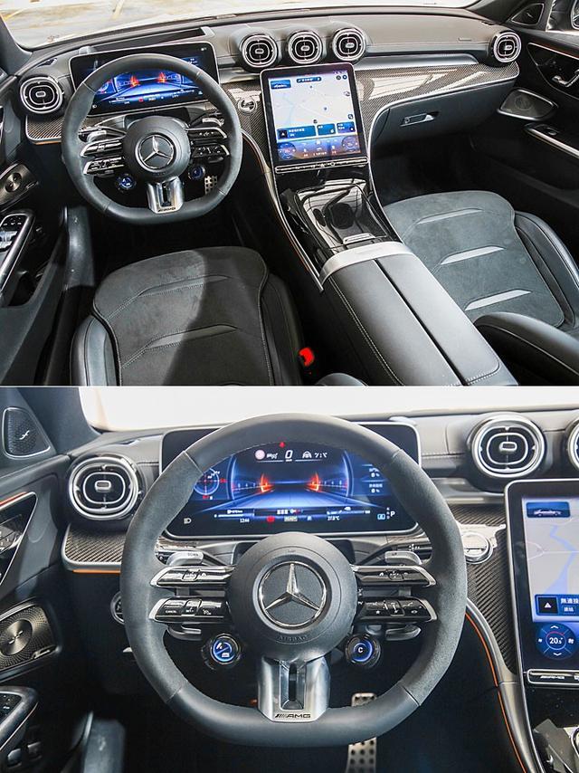C 63 S E Performance 内饰以 AMG 碳纤维饰板搭配 AMG 高性能 Nappa 真皮平底跑车场所盘,另外包含双区恒温、12.3 吋数位样子、11.9 吋中央触控荧幕、 MBUX 多媒体系统以及 Burmester 3D 环场音响系统等。