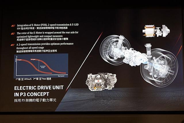 安置于后轮的 400V 电子能源单位整合包含 EDU 整契约步马达、电子限滑差速器与双速换档机构,其中一档可对应至时速 140 公里,二档则可达到车辆极速。