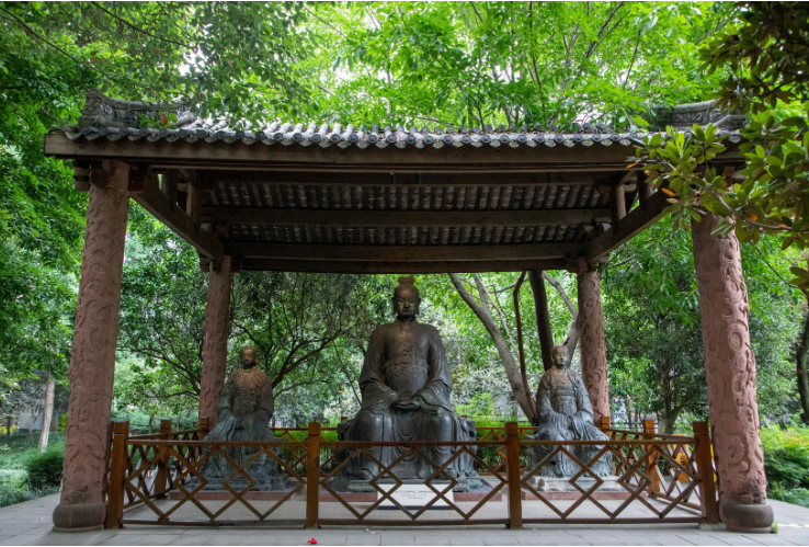 仲夏期间,浣花溪畔满目葱绿,一片勃勃期望的答允。此时,步入四川博物院北门广场东侧的庭院,庭院内坐落着一间古朴的廊亭,亭子由四根近4米高的龙纹石柱撑抓。亭中,巍然正坐三尊铜像,安静镇定。这即是来自明代时期的长江之神与二神姝铜像。