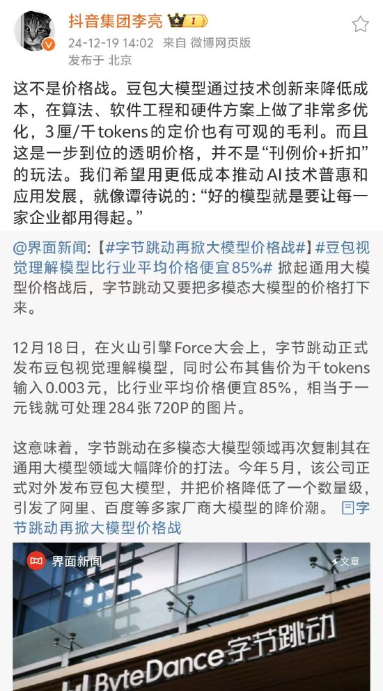 新浪科技讯 12月19日下昼音尘开云登录入口登录APP下载(中国)官方网站,抖音集团副总裁李亮发布微博暗示,豆包大模子降价不是价钱战,并进一步发达了豆包大模子的订价战略。