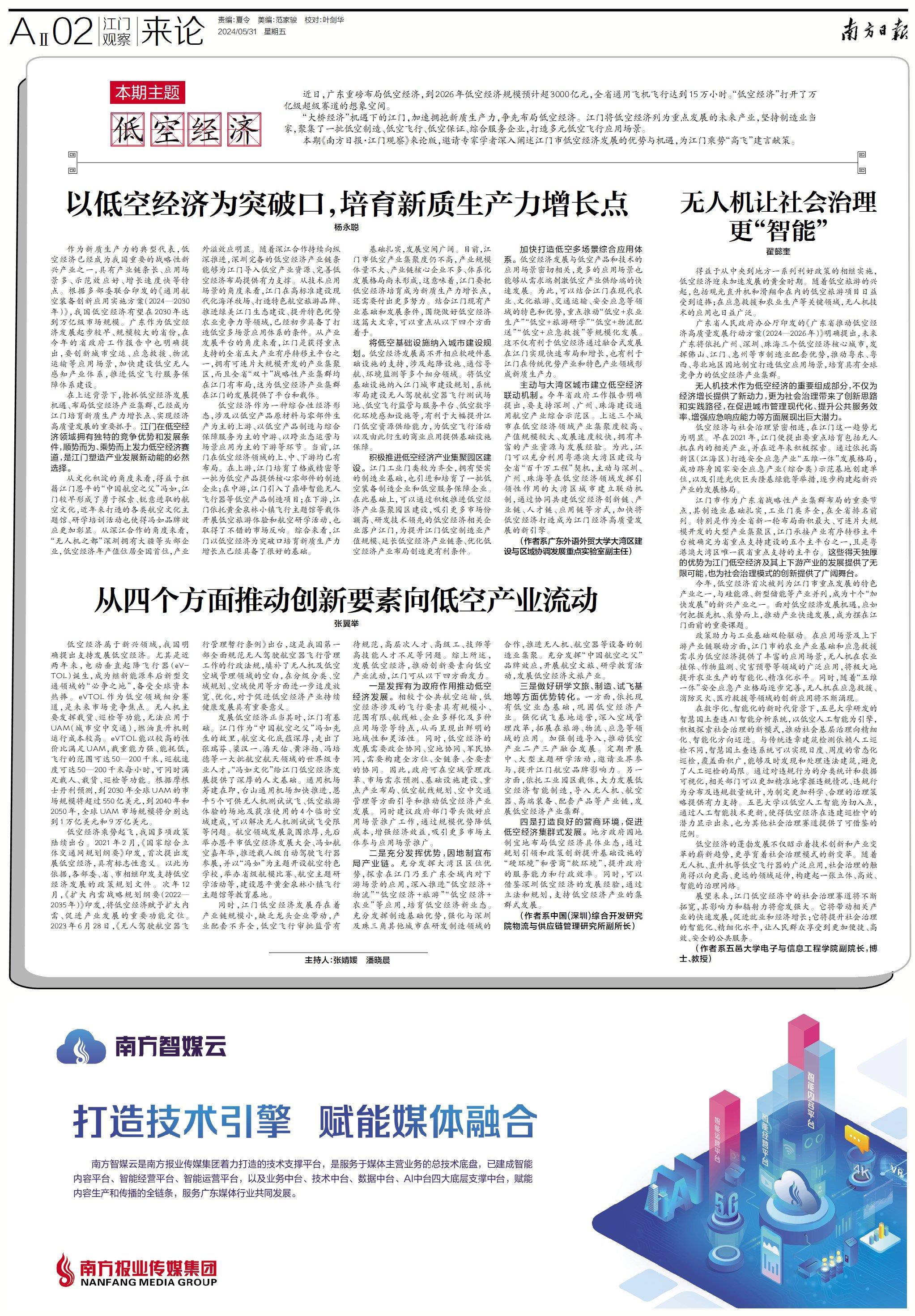 本期《南边日报·江门不雅察》来论版,邀请众人学者真切呈文江门市低空经济发展的上风与机遇,为江门乘势“高飞”建言献计。