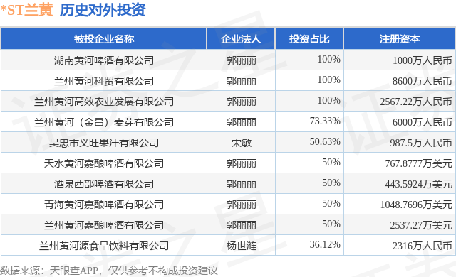 本站音问,说明天眼查APP浮现,*ST兰黄(000929.SZ)新增沿路对外投资事件,被投资公司为吴忠市义旺果汁有限公司,法定代表东说念主宋敏,投资占比为50.63%。该公司从事酒、饮料和精制茶制造业,注册本钱为987.5万东说念主民币。现在,*ST兰黄共存在对外投资10项,详见下表:
