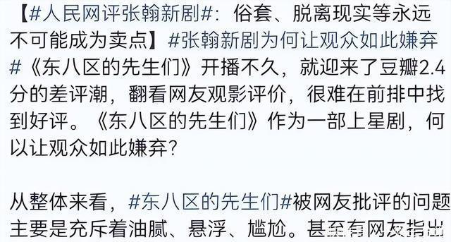 《东八区的先生们》 2022年8月,张翰自编自导自演的《东八区的先生们》上线。 这部堪称多年打磨的“忠诚之作”,在播出之后赶快激发群愤,被不雅众称为“职场性干扰的浓重霸总剧”。 剧中充斥着渊博示寂女性和低俗的擦边台词。
