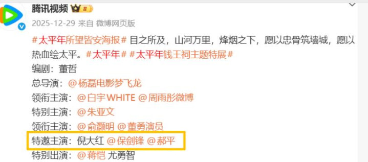 不外细看此次剧集的播出,会发现平台对他如故挺隐私的,原来在旧年的官宣里,他还被名称为“特邀主演”,跟倪大红放一栏。