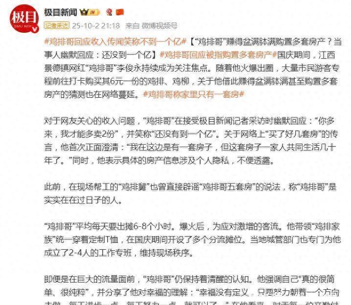 这个国庆,江西景德镇的“鸡排哥”李俊永绝对火了。6元一份的鸡排和鸡柳,不仅诱导了无数市民搭客赶赴打卡开云体育,更把他的收入推上了公论的风口浪尖。网罗上,“靠爆火买下多套房产”、“月入纵容过十万”的传言传得沸沸扬扬,俨然一副草根逆袭成富豪的脚本。