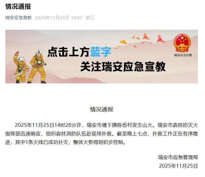 瑞安市救急处理局发布情况通报:2025年11月25日14时28分许开云登录入口登录APP下载(中国)官方网站,瑞安市塘下镇陈岙村发生山火。瑞安市丛林防熄灭开采部速即反应,组织丛林消防队列赴现场扑救。达成晚上七点,扑救职责正在有序鼓吹,其中1条火线已到手扑灭,举座火势取得初步适度。