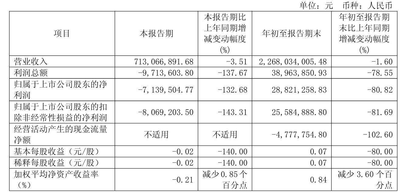 其中,第三季度,公司买卖收入为7.13亿元,同比下降3.51%;归母净利润失掉714万元,同比下降132.68%;扣非归母净利润失掉807万元,同比下降143.31%。